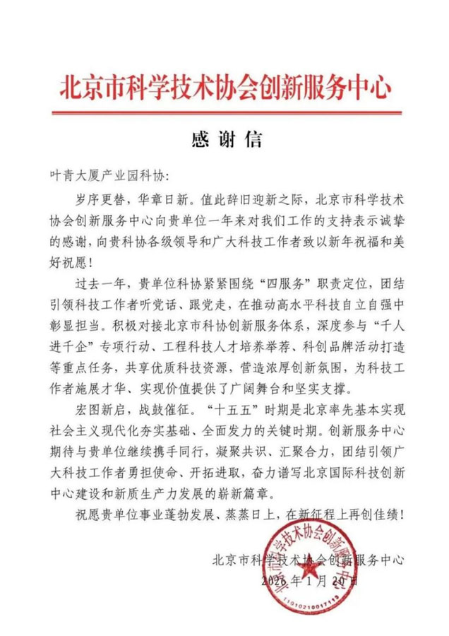 春节前夕,叶青大厦产业园科协收到北京市科学技术协会创新服务中心向发来的感谢信,对产业园科协一年来的工作致以诚挚谢意,向广大园区科技工作者送上新年祝福!纸短情长,字里行间是上级科协的认可与期许,更是对园区科协工作者们坚守初心、勇担使命的最好嘉奖。