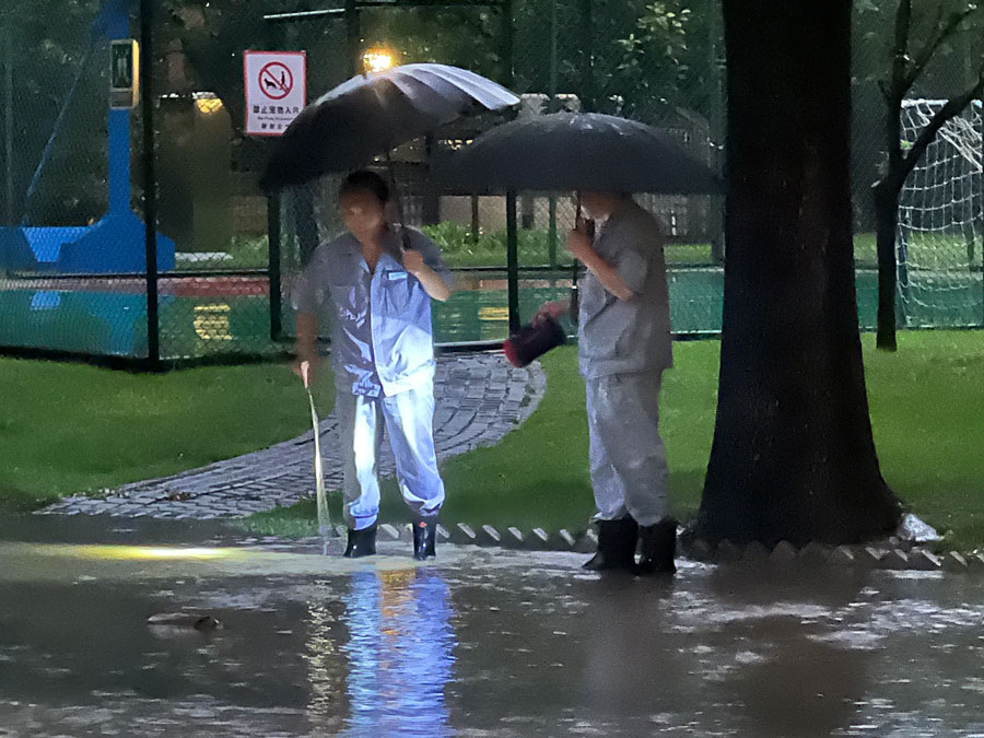 当风雨来临,物业人便成了最可靠的“守护者”。安保人员穿梭在各巡区,紧盯住户家屋顶污水管是否正常排污、有无脱落,关注门窗是否关好,路面积水一旦出现,便及时打开雨水井,立起警示标牌,让安全看得见;地势较低区域、南门/西门出入口、设备机房周边、鸭子湖桥水位线等重点部位,总有物业人“盯死守牢”,随时准备应对积水险情;园区道路、明沟、雨水篦子等排水设施旁,物业人持续巡查,及时清理落叶、杂物,让排水系统始终高效运转。