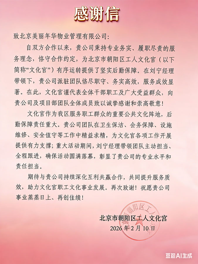 接下来,美丽年华物业团队将把这份感谢化为动力,持续提升服务标准、优化保障能力,以更扎实的举措、更暖心的服务,全力护航朝阳区工人文化宫各项工作开展,为打造安全、整洁、有序、温馨的职工文化事业发展贡献力量。